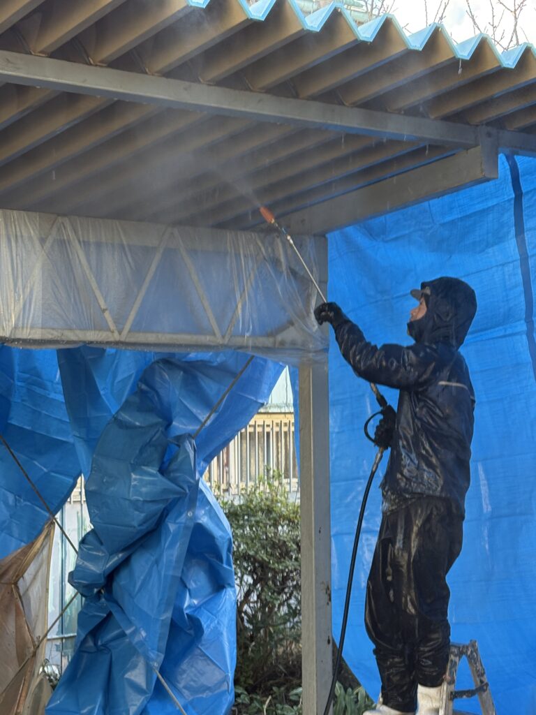 現場ブログ2025.12.22さくら市で折半屋根裏の高圧洗浄を行いましたこんにちは、神山塗装工業株式会社の鈴木圭太です。今日の作業は折半屋根裏の高圧洗浄でした。先週は屋根裏の劣化したペフ(断熱材)を剥がしました。今日は高圧洗浄で土埃などの汚れを落としていきます!塗装面に汚れが残っていると塗膜の剥がれに繋がるので、しっかり洗い落とします!今日は北風が強かったので、洗浄で出た汚水が近隣の住宅に飛散しないよう、ブルーシートを使用しながら洗浄しました。外壁塗装をお考えのお客様はぜひ、神山塗装へお任せください。無料お見積はこちら