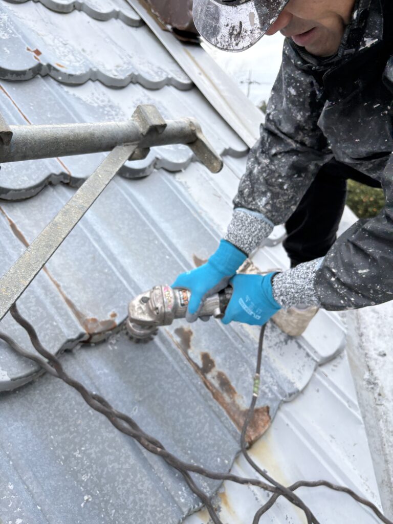サンダーケレンとは、ディスクサンダーという電動工具を使ったケレン方法です。今回のように全体にサビが発生しているトタン屋根をケレンするのに適しています。