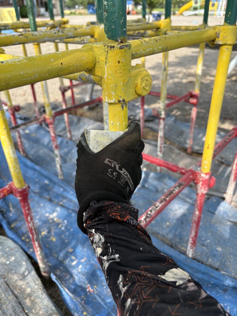 現場ブログ2025.08.04おおみや保育園で遊具のケレンを行いましたこんにちは、神山塗装工業株式会社の鈴木圭太です。今日の作業は、大宮にあるおおみや保育園で遊具のケレンでした。今回塗り替えるのはジャングルジム、ブランコ、滑り台の3つです。どれもサビや塗膜の剥がれが見られたので、塗装前にケレンによる下地調整を行います!下地調整は塗装の仕上がりを美しく、長持ちさせるために行う大切な工程です。子ども達に喜んでもらえるような仕上がりにするため、明日からの塗装も頑張りたいと思います!外壁塗装をお考えのお客様はぜひ、神山塗装へお任せください。無料お見積はこちら