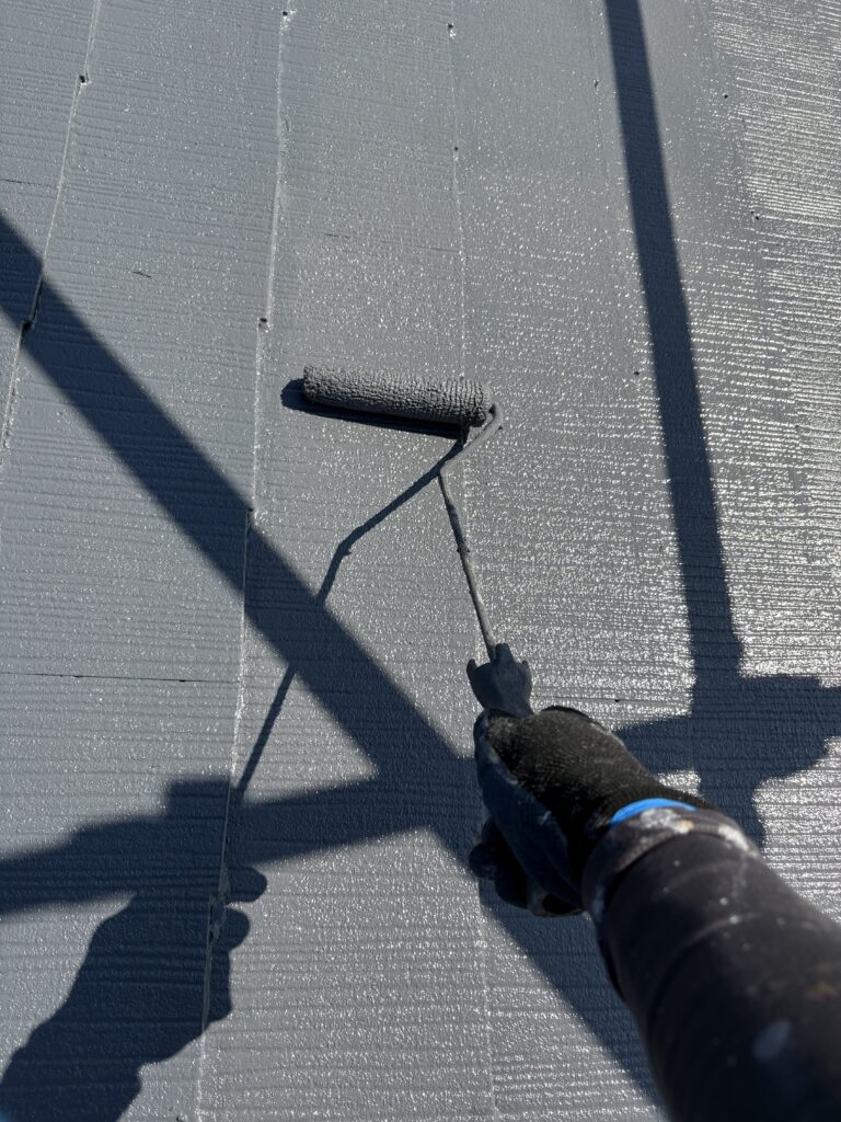 上塗りには屋根の美観と耐久性を向上させる役割があるので、塗り残しの無いようしっかり塗装しました!