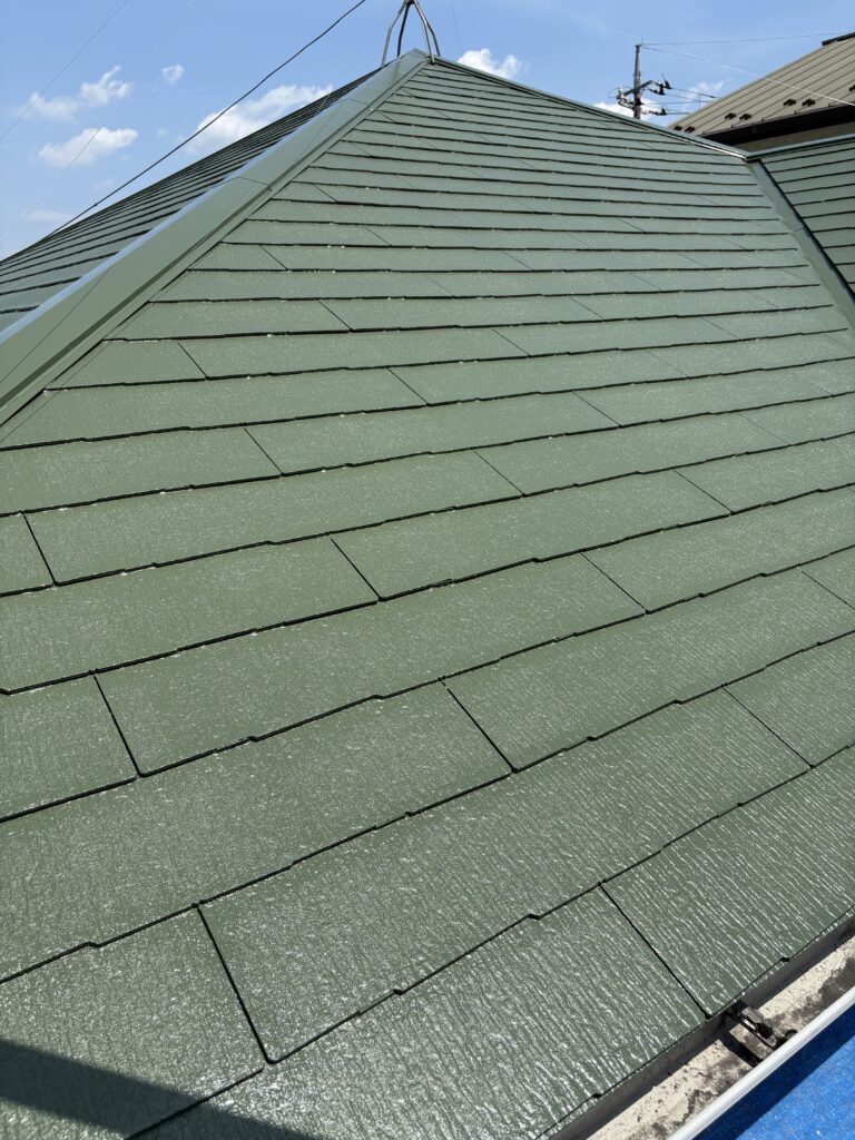 上塗りの色にはオリーブグリーンを使用しました。緑色の屋根は汚れが目立ちにくい、外観に個性を出せるなどのメリットがあります。