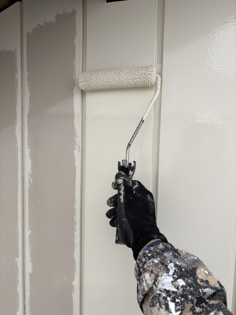 今回の外壁塗装は下塗り、上塗りの2回に分けて行います。上塗りは外壁の美観や塗膜の耐久性を高める仕上げの工程です。