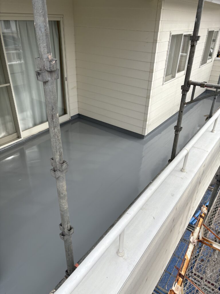 こんにちは、神山塗装工業株式会社の鈴木圭太です。今日の作業はベランダ床(塩ビシート)の防水塗装でした。