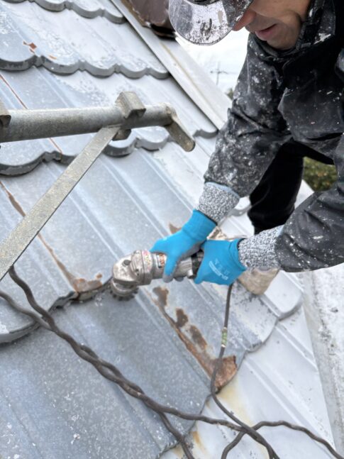 そして今日行った上塗りは、紫外線から防水層を保護し劣化を防ぐために行います。上塗りには弾性トップ14を使用しました。