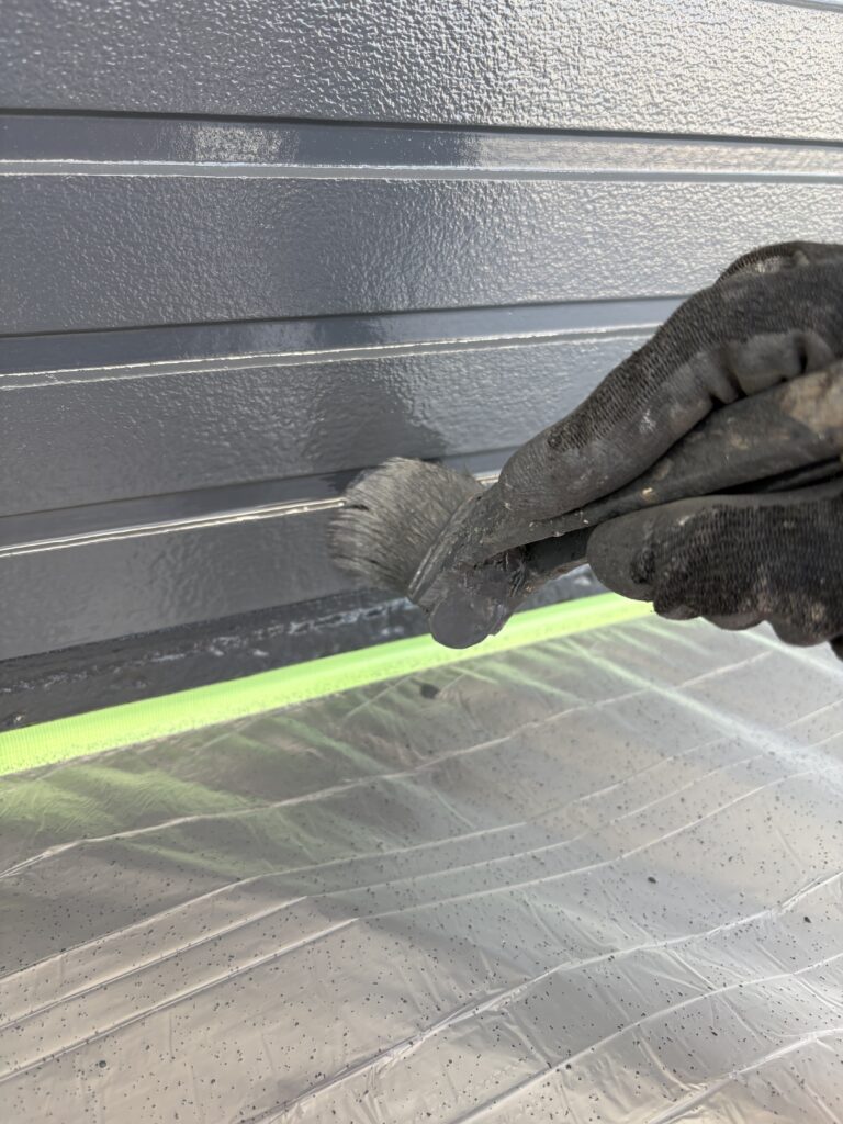 今回の外壁塗装は下塗り、中塗り、上塗りの3回に分けて行います。上塗りは外壁の美観や耐久性を高めるための仕上げ作業となります。