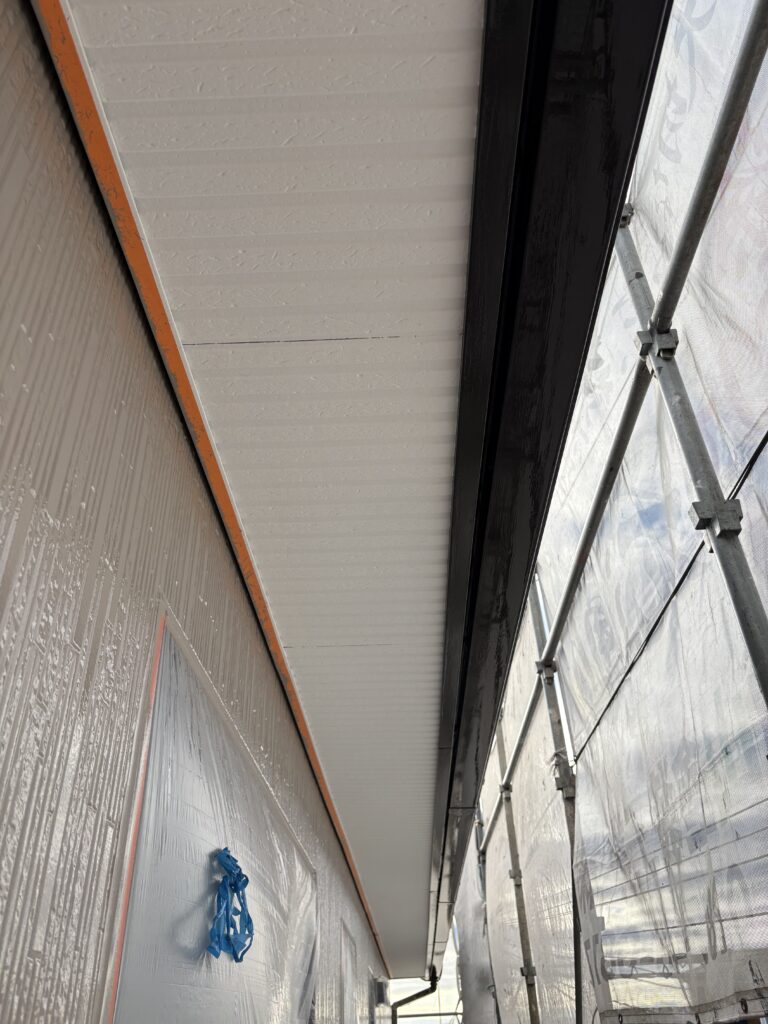 こんにちは、真面目にコツコツ50年住宅塗装に特化した神山塗装工業株式会社の鈴木圭太です。今日の作業は軒天の上塗りでした。