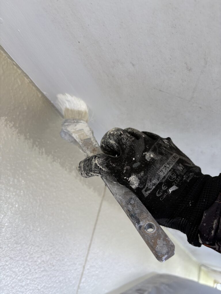 こんにちは、真面目にコツコツ50年住宅塗装に特化した神山塗装工業株式会社の鈴木圭太です。今日の作業は軒天の上塗りでした。