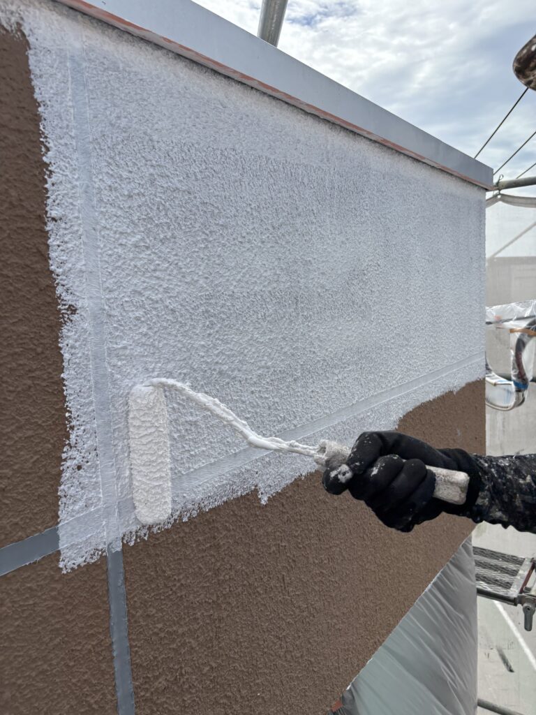 今回の外壁塗装は3回行います。下塗りは水性下地調整材を、中塗りと上塗りはシリコン塗料を使用します。