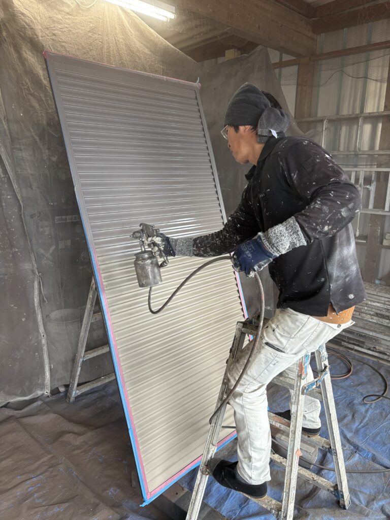 こんにちは、神山塗装株式会社の鈴木圭太です。今日の作業は雨戸の吹付塗装でした。