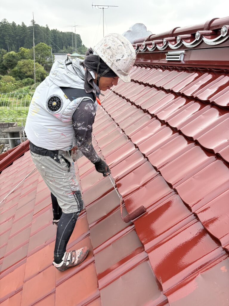 こんにちは、神山塗装工業株式会社の鈴木圭太です。今日の作業はトタン瓦屋根の上塗りでした。