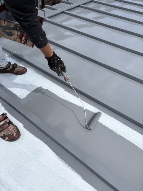トタン瓦屋根は2回塗装します。屋根の錆部分をケレンした後、錆止め塗料で下塗り、屋根用シリコン塗料で上塗りを行います。