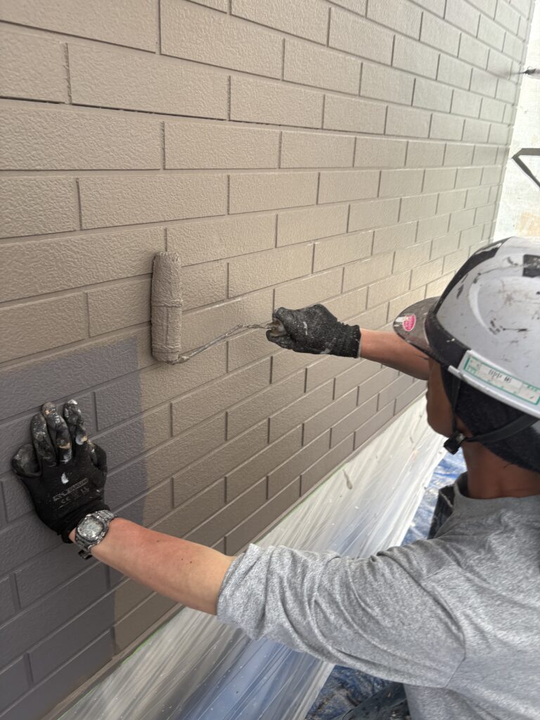 今回の外壁塗装はアレスアクアビルドで、下塗りと上塗りの2回に分けて行いました。