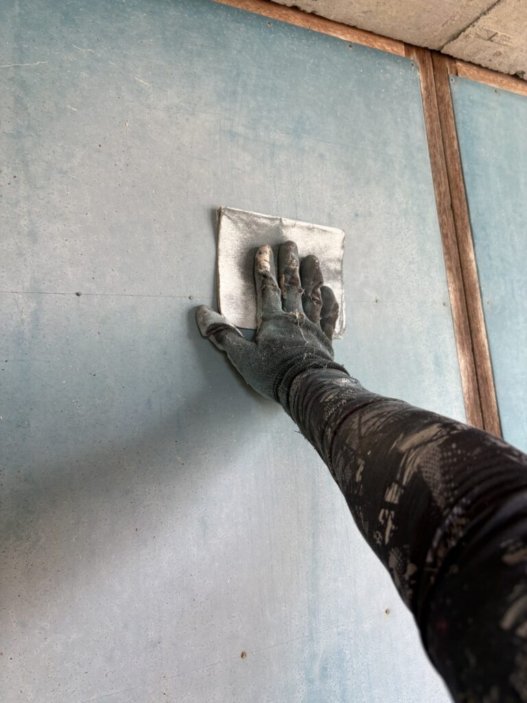納屋扉の塗装は、シリコン塗料の1回塗りで仕上げます。扉の表面は白サビでザラザラしていたので、紙ヤスリでケレンを行ってから塗装しました。