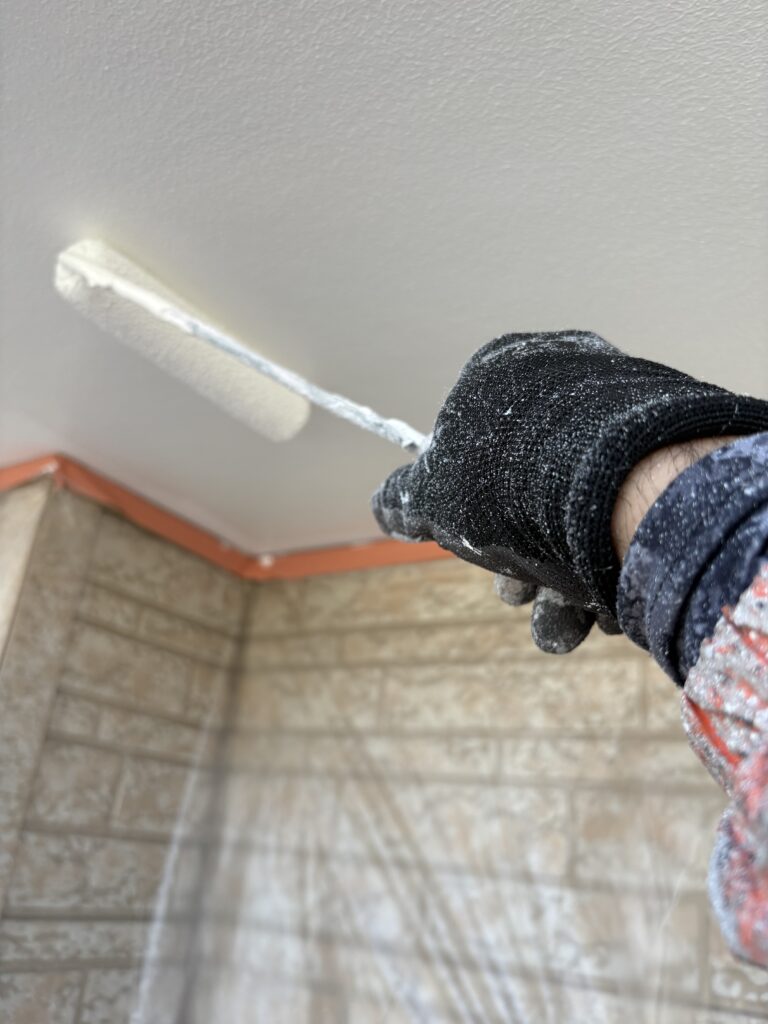 こんにちは、神山塗装工業株式会社の鈴木圭太です。今日の作業は軒天の上塗りでした。