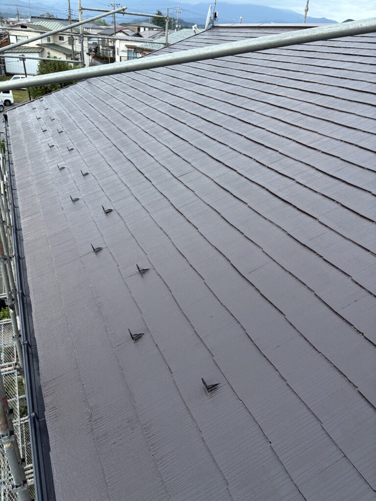 こんにちは、神山塗装工業株式会社の鈴木圭太です。今日の作業はコロニアル屋根の上塗りでした。