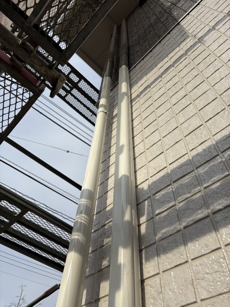 今回はRSシルバーマイルドSiで塗り替えを行いました。雨樋は塗り継ぎが目立ちやすいので、雨樋を固定する金具部分まで通し塗りするのが基本です。