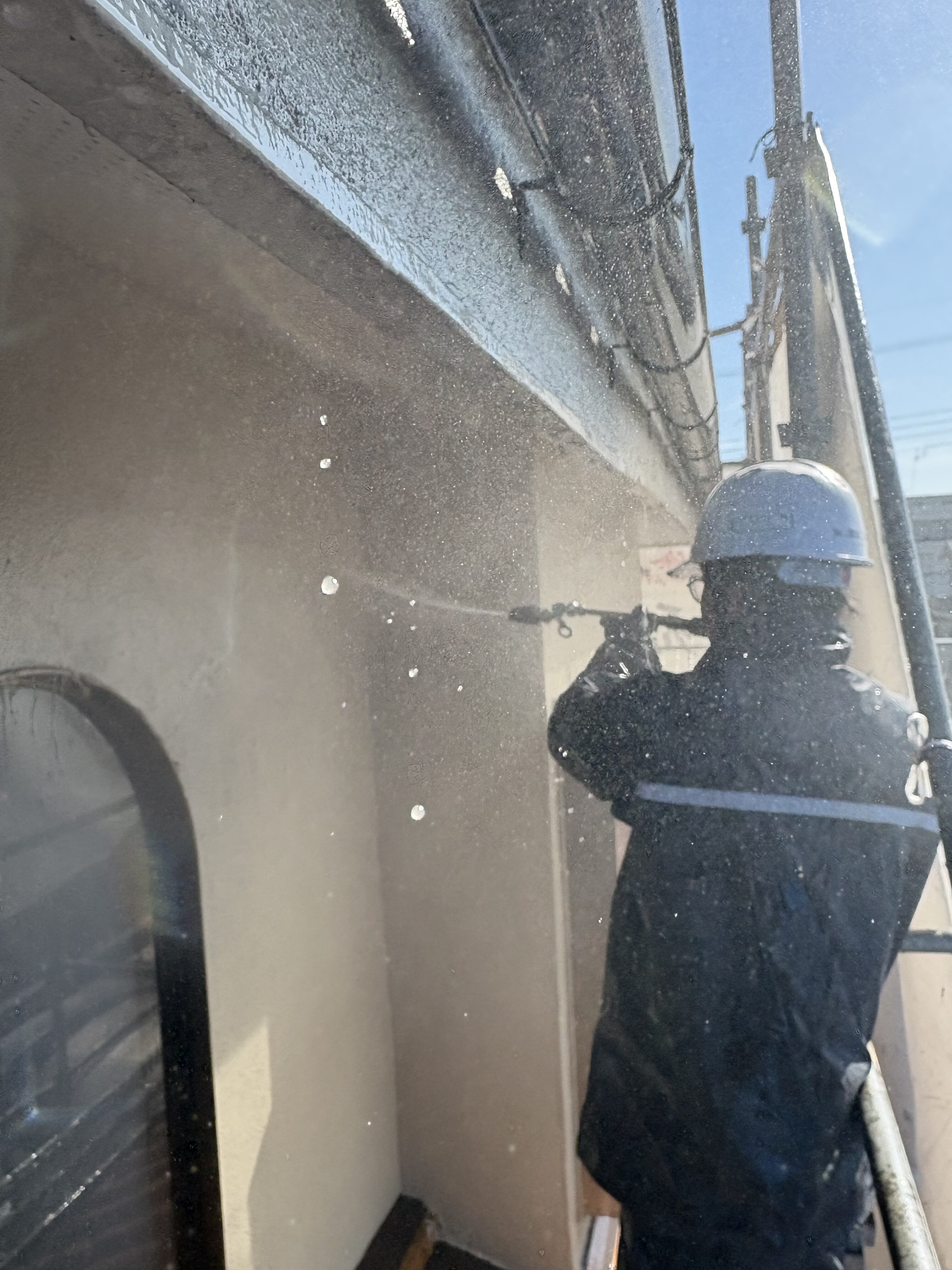 こんにちは、真面目にコツコツ50年住宅塗装に特化した神山塗装工業株式会社の鈴木圭太です。今日の作業はモルタル外壁の高圧洗浄でした。