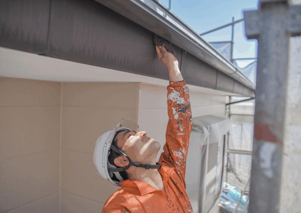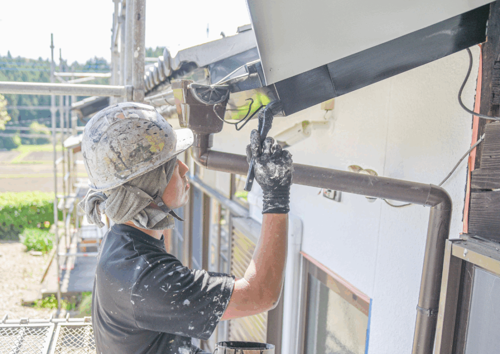 その後、雨樋や雨戸など壁以外の木部や鉄部の付帯塗装を仕上げます。ここまで来ると、お客様のお家の塗装工事をしているというよりも、「自分の作品を仕上げた」という感覚に浸っているのが、塗装技術者の大半の気持ちですね。