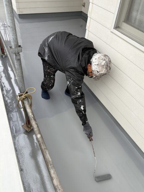 現場ブログこんにちは、神山塗装工業株式会社の鈴木圭太です。今日の作業はベランダ床(塩ビシート)の防水塗装でした。 今回は下塗り・中塗り・上塗り1回目・上塗り2回目の計4回塗装します。今日は上塗り1回目を行いました。 上塗りには耐候...