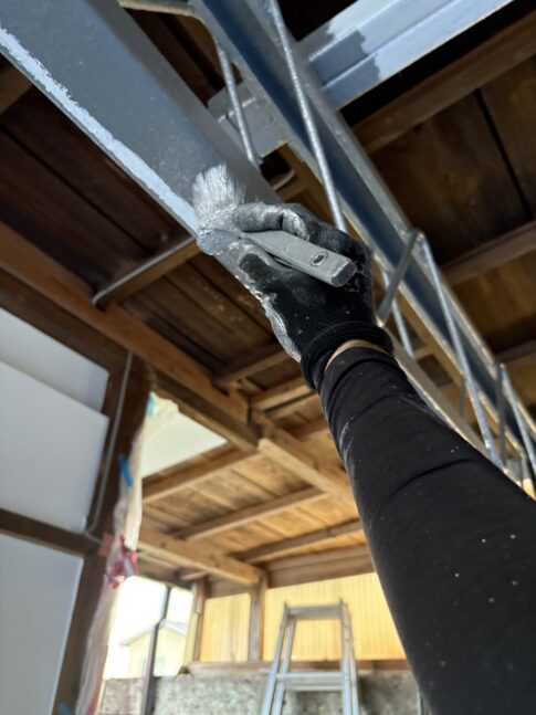 現場ブログこんにちは、神山塗装工業株式会社の鈴木圭太です。今日の作業は納屋鉄骨の下塗りでした。 納屋鉄骨の塗装は、下塗りと上塗りの2回行います。下塗りはサビ止め塗料、上塗りは厚膜形エポキシアルミニウム塗料を使用します。 鉄骨には所...